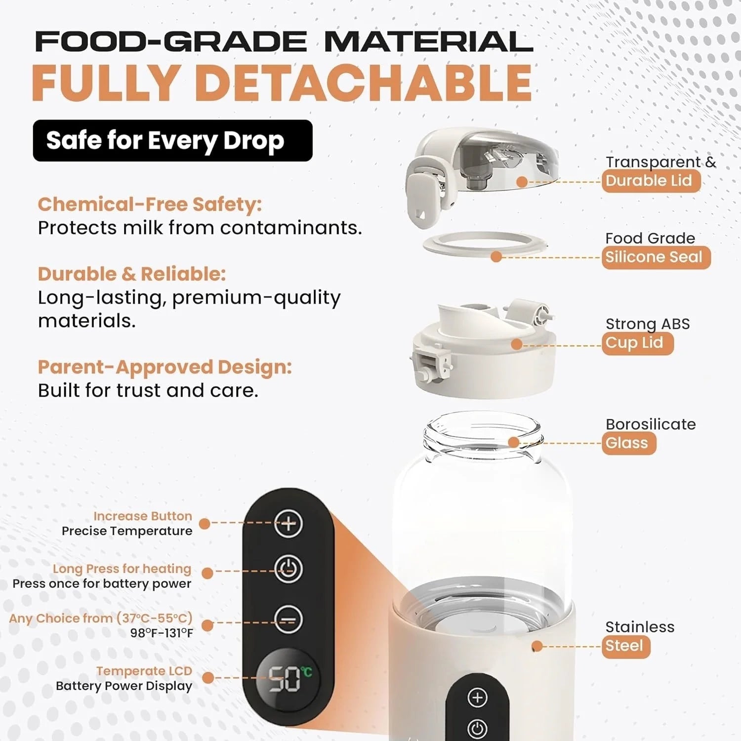 - **Klasa Spożywcza**: Wykonany z **wysokiej jakości szkła borokrzemowego** (bez BPA) + **podgrzewającej podstawy ze stali nierdzewnej 316 SUS** – gwarantuje, że każdy łyk jest wolny od toksyn i bezpieczny dla delikatnych brzuszków.